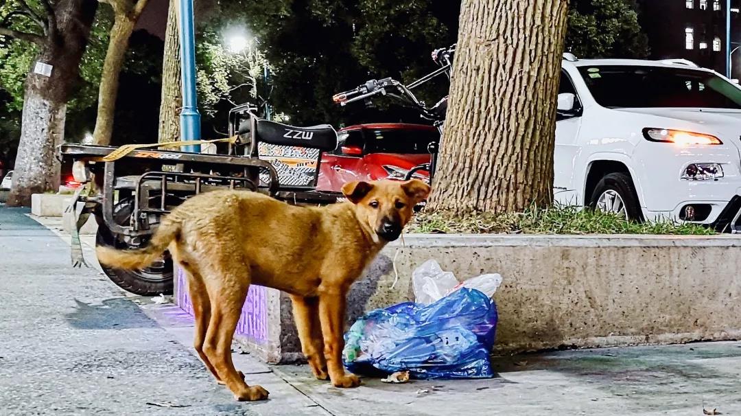 麓山南路荫马塘公交站附近/翻找垃圾的大黄狗,垃圾袋后来被环卫工人收走了