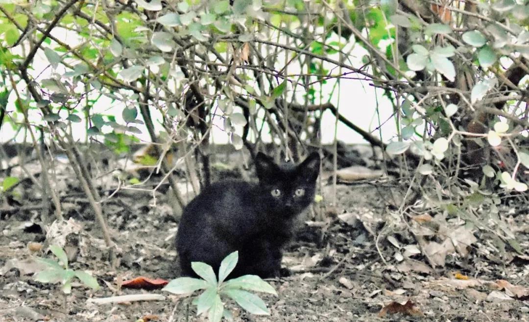 天马园区一区一栋附近/两个星期后,只见这只小黑猫。旁边投喂的女生说,经常在寝室听到猫叫,会偶尔来投喂