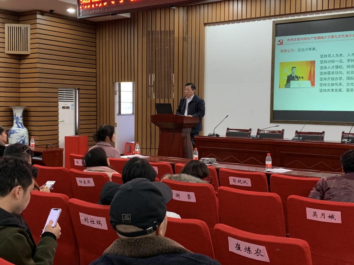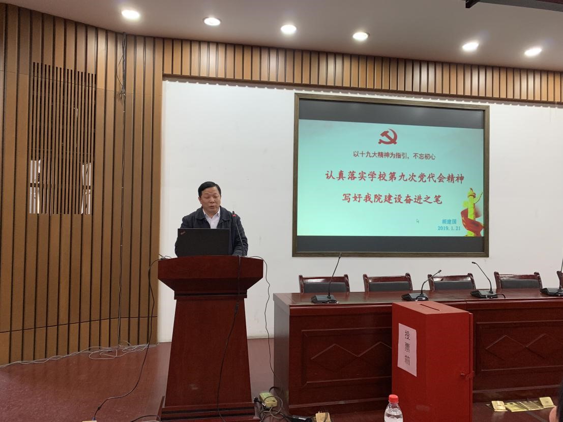 第九次代表大会精神。新影院全体教职工参加会议,学院党委书记胡建国主持会议并讲话。