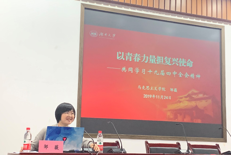 马克思主义学院的邹薇老师,为我们带来“以青春力量担复兴使命——共同学习十九届四中全会精神”主题课程讲授。