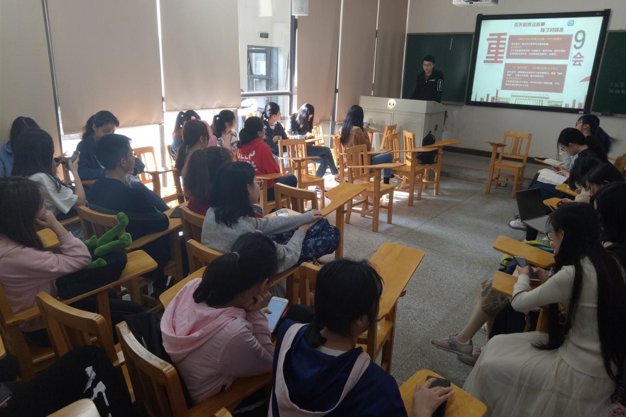 首先,团支书播放了有关两会的视频。视频中介绍了如“避免数字环保确保环境质量”、“救命救急药进医保”等两会重点内容。视频后,团支书又带领全班同学深入走进两会中初次审议且备受关注的《外商投资法(草案)》,并通过PPT进行详细的展示,使同学们了解到,外商投资法的逐步确立,不仅是填补我国经济立法空白的重大举措,也是“外资三法”合一的必经之径,具有历史性的意义。