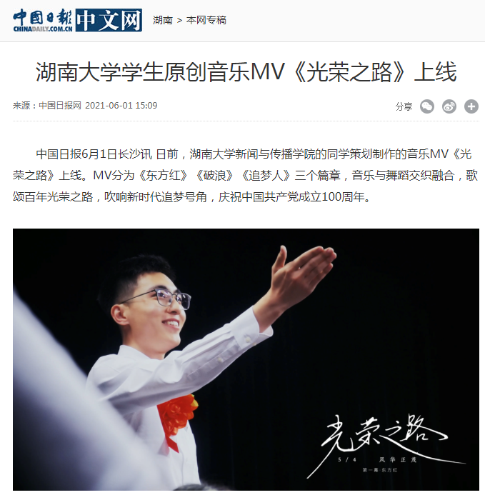 的同学策划制作的音乐MV《光荣之路》上线。MV分为《东方红》《破浪》《追梦人》三个篇章,音乐与舞蹈交织融合,歌颂百年光荣之路,吹响新时代追梦号角,庆祝中国共产党成立100周年。