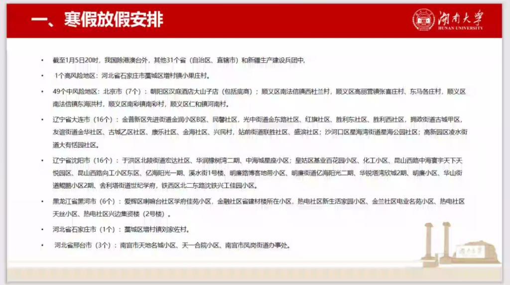 会议中,伍老师表示,为了保障学生安全,且考虑到近期各地疫情反弹情况,目前家乡为中高风险地区的同学可以不急于回家,学工部已在制订更为详尽的工作方案,有关寒假的具体安排一旦有所调整,学院会第一时间下达通知,望同学们稍安勿躁;