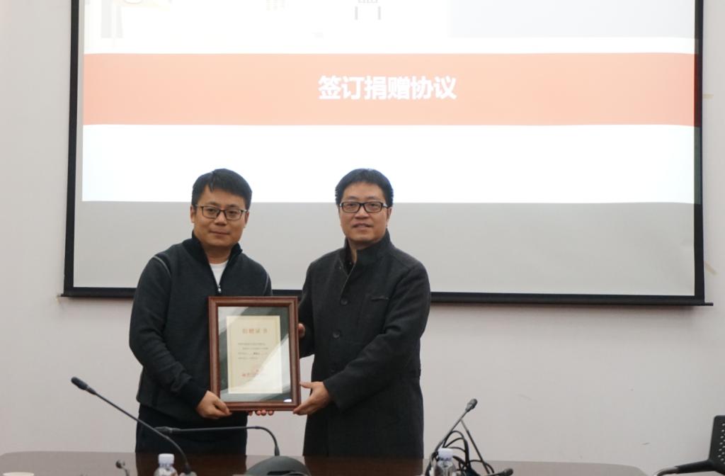 彭祝斌院长(右)为安超校友(左)颁发捐赠证书