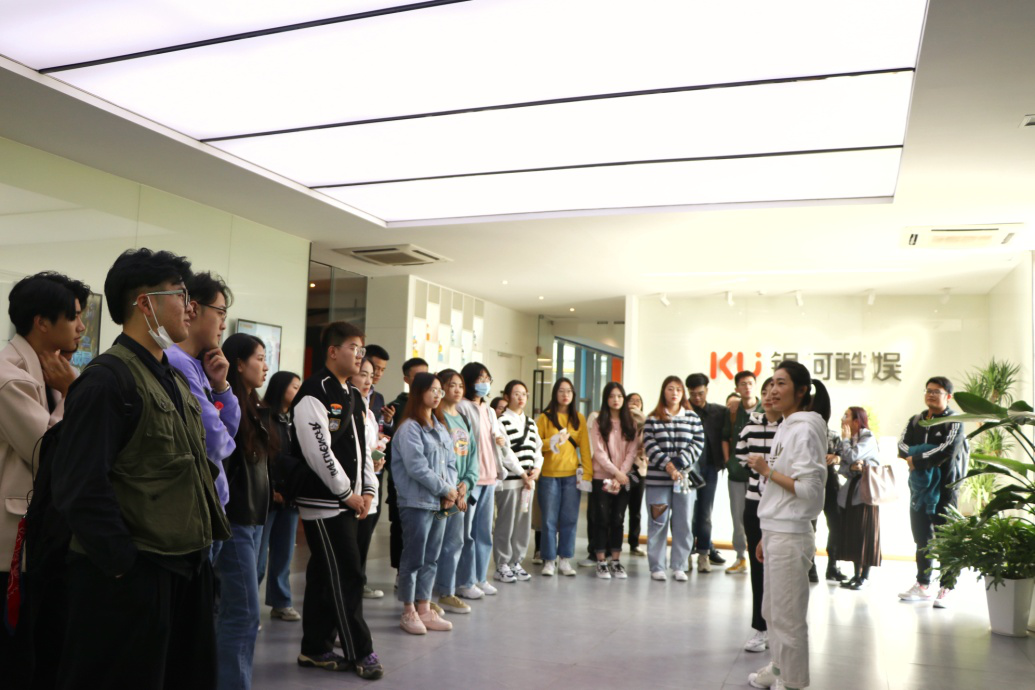 随后,同学们来到了三楼的银河酷娱公司,这是总书记习近平此次调研重点考察的民营企业。墙上“导向金不换”的字画非常醒目,总书记在考察过程中也对这句话给予了高度肯定。随后,在银河酷娱总经办主任刘晓的带领下,同学们一边参观银河酷娱公司,一边从短视频创作到综艺、影视剧,全方位感受互联网视频内容的全产业链、生态链。