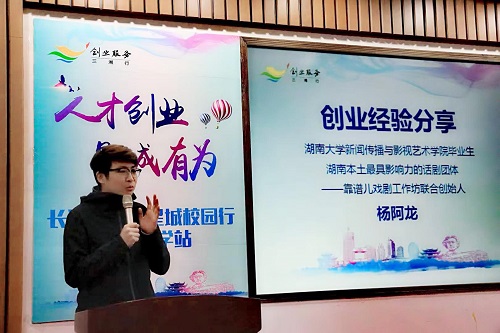优秀的学长学姐作为毕业生创业代表也来到现场,和大家分享创新创业经验。杨阿龙学长是湖南本土最具影响力的话剧团体“靠谱儿”戏剧工作坊的联合创始人,创业长达八年之久。他说,想起当初创业时的艰辛,至今内心还会波澜起伏。