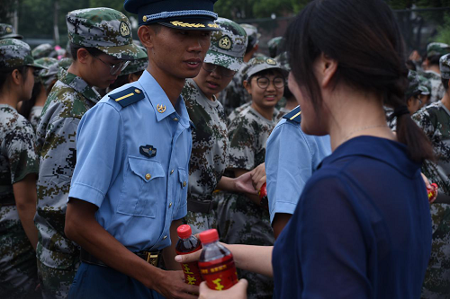 各位领导稍后给新生和教官们发放了凉茶,这些举措让同学们深表感动。新传1803班苗力文说道:"来到大学,虽然身边没有熟悉的人,但是遇到专程送来凉茶慰问的领导老师,还遇到了那些友好的同学,让我觉得非常幸福"。军训即将临近尾声,此次领导慰问正是为参训新生加油打气,增强他们的精神动力。相信在军训最后几天,他们也会以最好的精神状态,鼓足干劲、勇往直前、坚持到底!