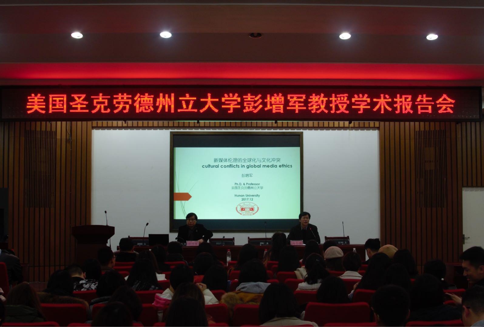 向志强副院长向同学们介绍彭增军教授的基本情况后,讲座正式开始。本次讲座以“新媒介伦理全球化与文化冲突”为主题。彭增军教授指出,新媒体出现后,媒介生态的变化引发了关于媒介伦理新的冲突和挑战。彭教授还认为,随着经济的全球化、一体化和文化的多样化,文化差异导致我们正步入一个冲突、不平等和碎片化的时代。