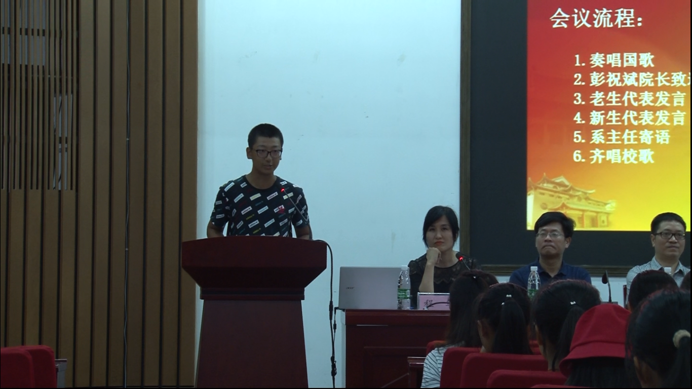 为了让新生们更真实地了解到大学生活,新影院第七届学生会主席14级播音班刘聪同学向新生们介绍了自己大学生活的经历与担任学生干部的经验和收获,教会同学们如何将工作和学习进行良好的协调,做到既不耽误学习,又培养好实践能力。新传1705班兰东旭同学作为新生代表发言,他表示会尽快适应学校的一切,在新的环境好好学习,找到最适合自己的学习目标和学习方法,学有所悟,学有所成。
