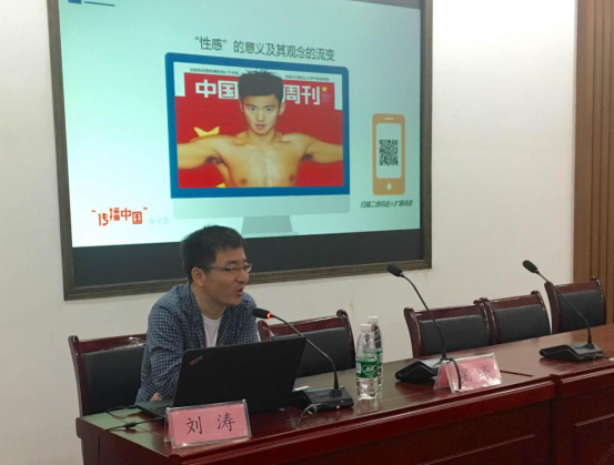 的刘涛老师以“媒介文化与身体批评”为主题,以“性感”的意义及其观念的流变拉开了序幕。他从身体的观念入手分析,重点介绍了媒介景观中的身体叙事,以“身体生产的政治经济学”、“身体作为权利运作的媒介”、“身体作为社会抗争的符号”为支撑,结合了耳熟能详的《人生》、《天浴》、《推拿》等影视作品为案例,将抽象的理论变为具象的事例,给大家留下了深刻的印象。