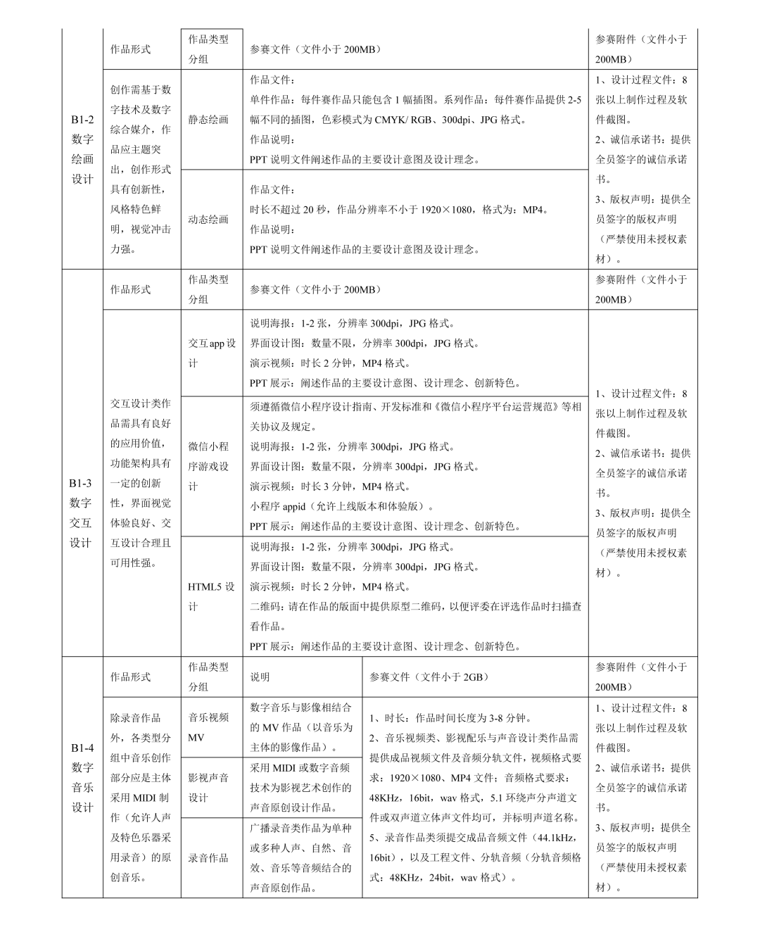 B 类为主题创作赛。B 类包括:B1 全媒体设计;B2 数字智能产品设计。B1 全媒体设计,细分以下类别单独评审:B1-1 数字影像动画设计(影视、动画、微电影)、B1-2 数字绘画设计、B1-3 数字交互设计、B1-4 数字音乐设计。B1-1 数字影像动画设计分为两个竞赛单元:数字影视组;数字动画组。借助数字化设备、采用影视拍摄或动画制作技术进行创作,反映一定故事情节或体现人文、历史、景观、文化特征的作品,形式包括但不仅限于影视短片、微电影、数字短片、纪录片、二维或三维动画等。B1-2 数字绘画设计分为两个竞赛单元:静态绘画组及动态绘画组。创作需基于数字技术及数字综合媒介,作品应主题突出,创作形式具有创新性,风格特色鲜明,视觉冲击力强。B1-3 数字交互设计分为三个竞赛单元:交互 App 设计;微信小程序游戏设计;HTML5 设计。交互设计类作品需具有良好的应用价值,功能架构具有一定的创新性,界面视觉体验良好、交互设计合理且可用性强。B1-4 数字音乐设计分为三个竞赛单元:音乐视频 MV、影视声音设计、录音作品。采用 MIDI 或数字音频技术录制的原创音乐作品,内容健康、积极向上。B2 数字智能产品设计细分以下类别单独评审:B2-1 数字智能交通与工程(各类型智能交通工具、工程器材、工业设备等);B2-2 数字智能公共与家居(各类型用于公共环境或家居环境的智能产品);B2-3 数字智能电子与文创(各类型智能电子产品或文化创意产品)。突出数字创意设计的大赛主题,体现智能化生活。借助数字化设备,采用三维建模及动画制作技术进行相应创作。参赛内容具体要求详见附件一。
