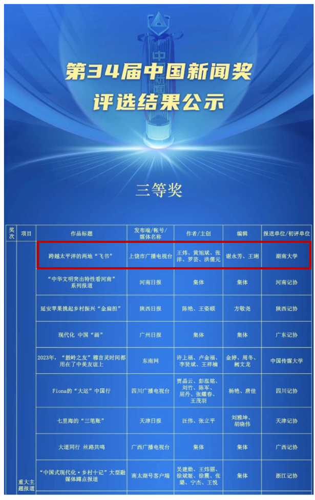 2024年10 月 29 日,中国记协对第 34 届中国新闻奖评选结果进行公示,来自全国各级各类媒体的 378 件作品入选拟获奖名单。其中,上饶市广播电视台的新闻专题片《跨越太平洋的两地 “飞书”》荣获第 34 届中国新闻奖重大主题报道三等奖。这是自2016年担任试点报送单位以来,小黄书